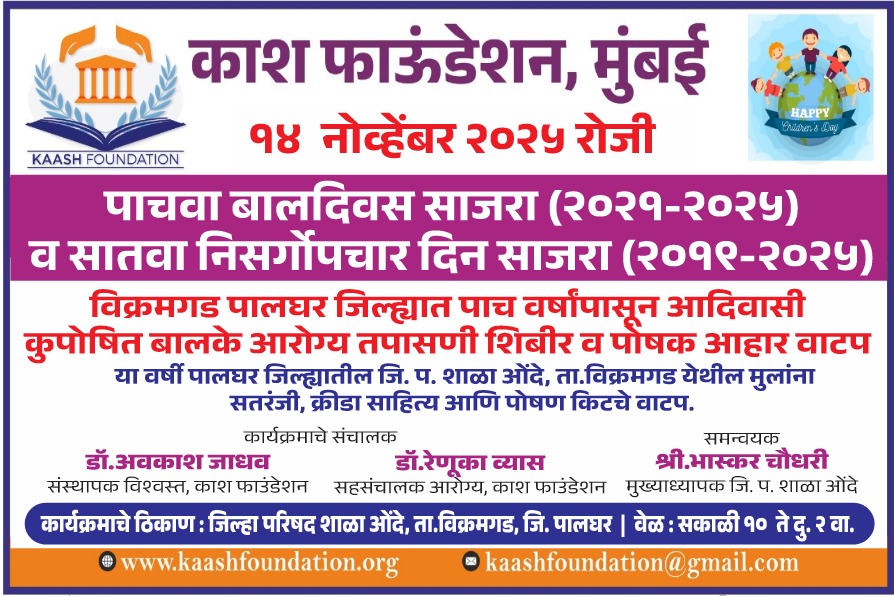 KAASH Foundation Mumbai is proud to celebrate its Fifth Children’s Day and Seventh Naturopathy Day on 14 November 2025 at Onde Grampanchayat School, Vikramgadh Palghar District Maharashtra.
