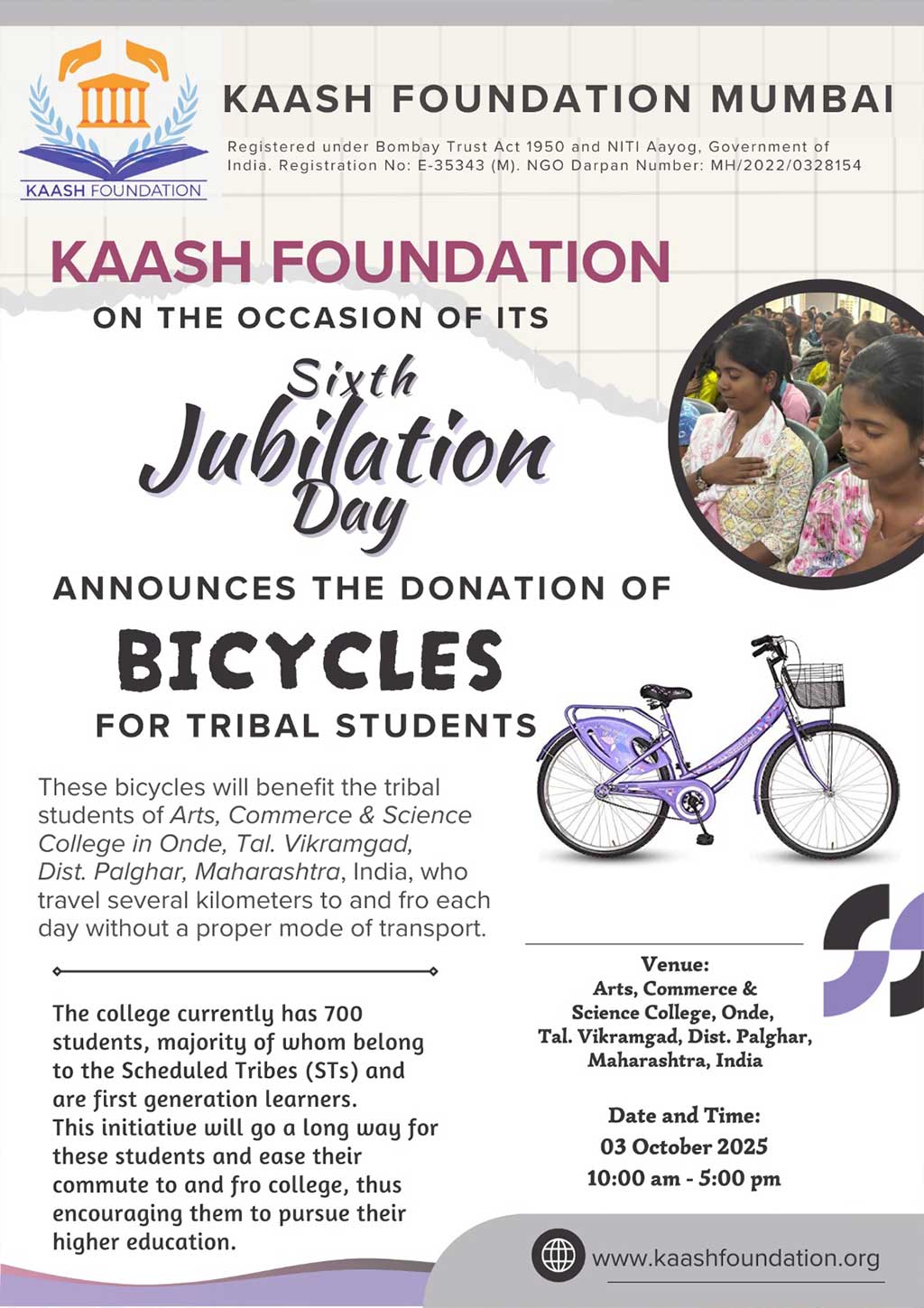 On this occassion of Sixth Jubilation Day Kaash foundaton announces the Donation of Bicycles for Tribal Students